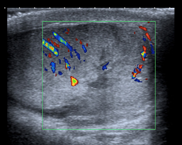 Fig. 1. Ecografía testicular, donde se objetiva aumento de tamaño escrotal derecho con engrosamiento de cubiertas y con alteración del contorno del testículo, en su polo inferior, compatible con rotura de la túnica albugínea. El testículo derecho conserva flujo Doppler color y pulsado en su interior en todo su parénquima.