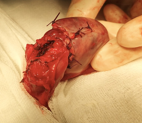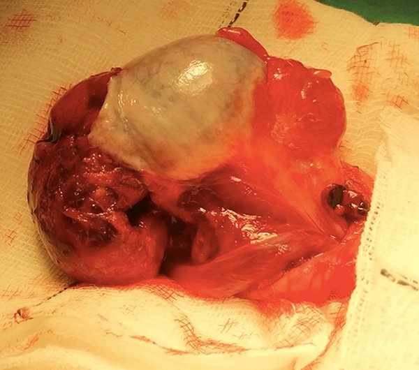 Fig. 2. Teste en quirófano, se objetiva disrupción de la albugínea y salida de parénquima testicular.